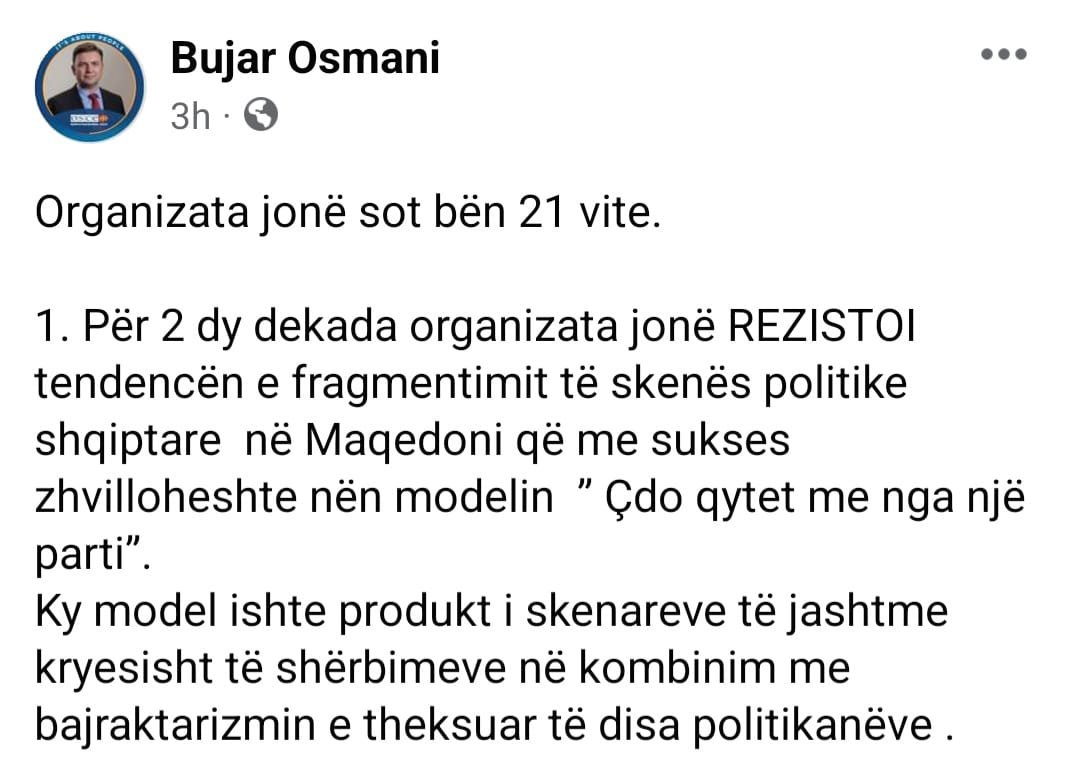 Kryediplomati shqiptar i RMV Bujar Osmani, njëherazi edhe zëdhënës i Bashkimit Demokratik për Integrim, në rrjetin social facebook ka shkruar me rastin e 21 vjetorit të partisë.