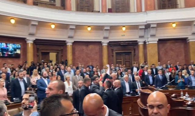 Kjo seancë filloi me thirrjet “hajdutë” dhe “jashtë”, me fishkëllima dhe zhurmë nga deputetët e opozitës drejtuar qeverisë serbe.